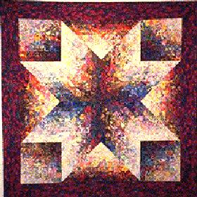 A. "Let Your Light Shine" 46" x 46", 1997 by Deanna Spingola. Foundation pieced. Displayed at the 1997 Fort Washington, PA. show and the 1997 IQF show at Houston. It was also in the "Quilts of Illusion" exhibit at the Fitton Center for Creative Arts in Hamilton, Ohio in July and August 1997. It was also at Quilt America 1997 and Paducah 1998.